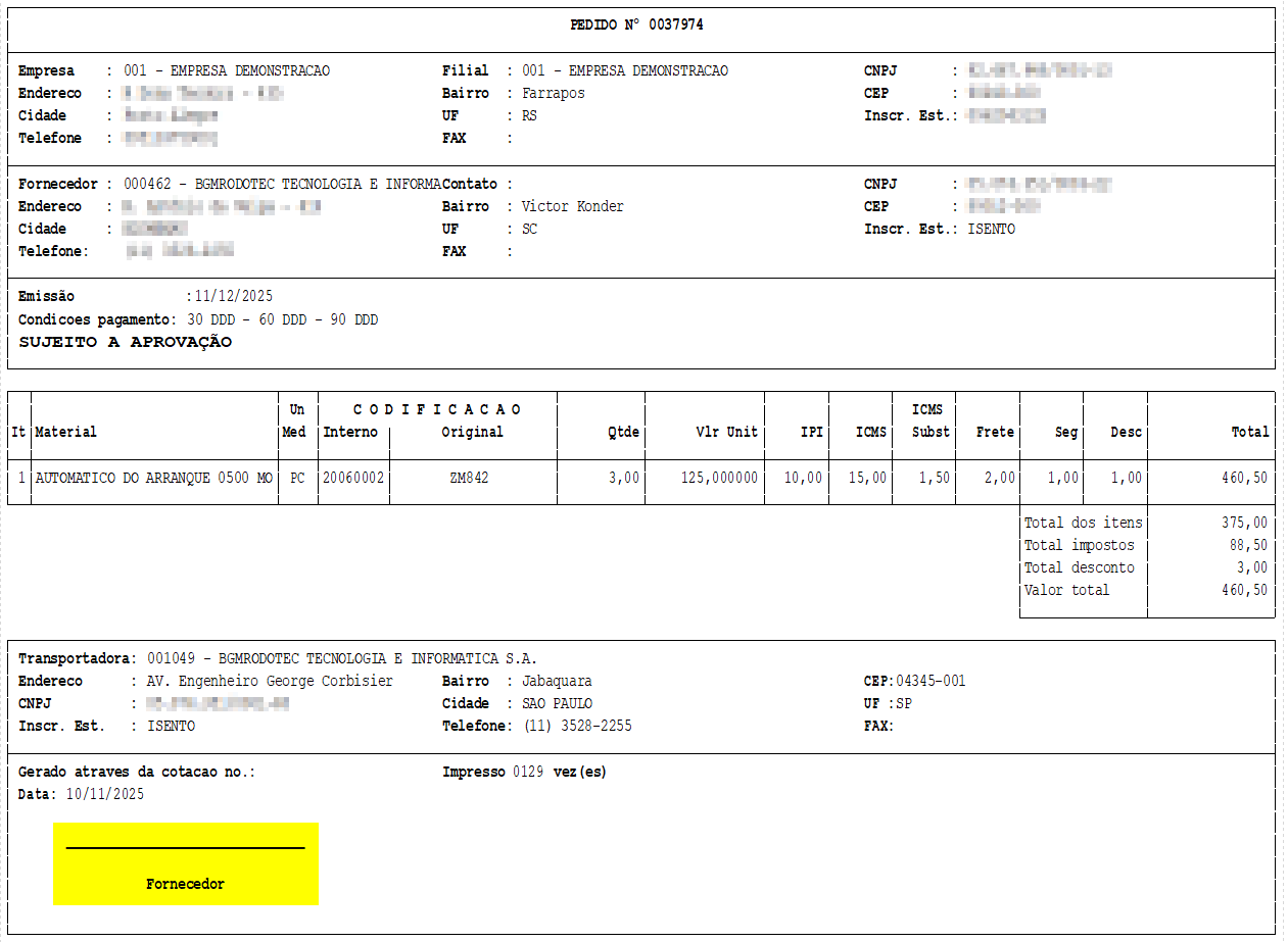 Imprimir campo para ass. do fornecedor - Com a opção marcada é impresso campo para assinatura do fornecedor.