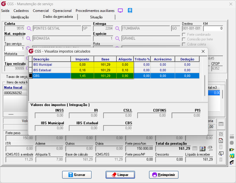 Documento no edi com os dados dos novos impostos: