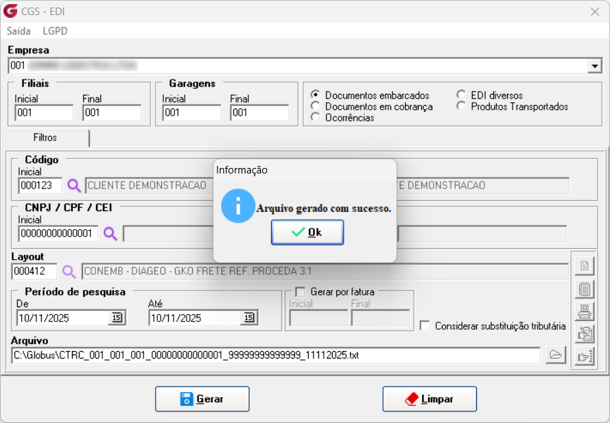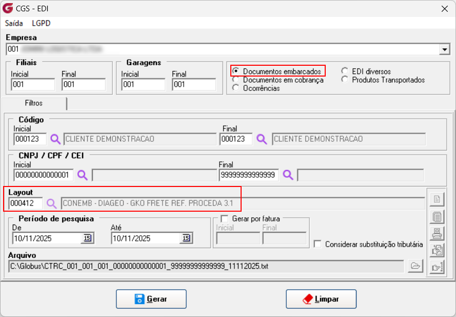2. Configuração de Layout Na tela de geração de EDI, acessada pelo caminho EDI Proceda à EDI, foi desenvolvido o layout 412 para exportar o arquivo CONEMB, com base nos documentos fiscais emitidos. Este layout é personalizado para atender às necessidades do embarcador DIAGEO BRASIL LTDA. ![]() Com base no manual fornecido pelo embarcador foi criado o Layout 412 do modelo CONEMB, com as informações dos novos impostos referente à Reforma Tributária (IBS Municipal/ IBS Estadual/CBS) 3. Geração do arquivo EDI