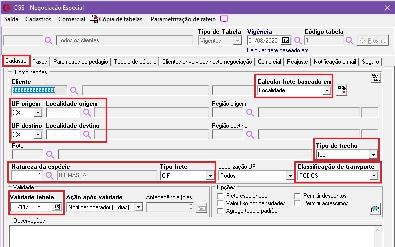 Informações como, se a tabela está vigente, localidade de origem e destino (dependendo da base para cálculo do frete, localidade, região ou rota), a natureza da espécie, tipo de frete, classificação de transporte, trecho, se a tabela de cálculo é por faixa de KM ou geral, se para um tipo de veículo ou grupo de produto específico.