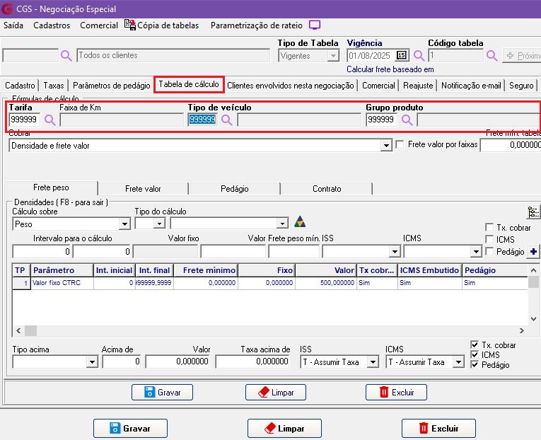 Na tabela de cálculo tendo condições específicas como veículo ou grupo de produto, precisa verificar se o tipo de veículo informado no documento é o mesmo da tabela ou se o produto está associado no grupo (cadastros > dados de produto > produtos por grupo) mencionado.