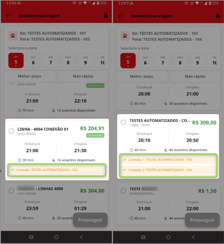 Objetivos: Atender a demanda de vendas diretamente pelo aplicativo nas viagens onde existe o tipo Conexão, permitindo assim que o cliente usuário possa ter a autonomia de escolher entre as viagens comuns e conexão, conforme seleção dos trechos desejados. Imagens meramente ilustrativas: Figura 01 – Imagem ilustrativa da seleção de viagens do tipo Conexão: