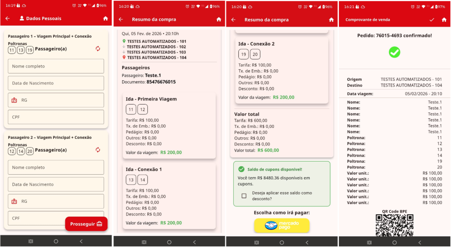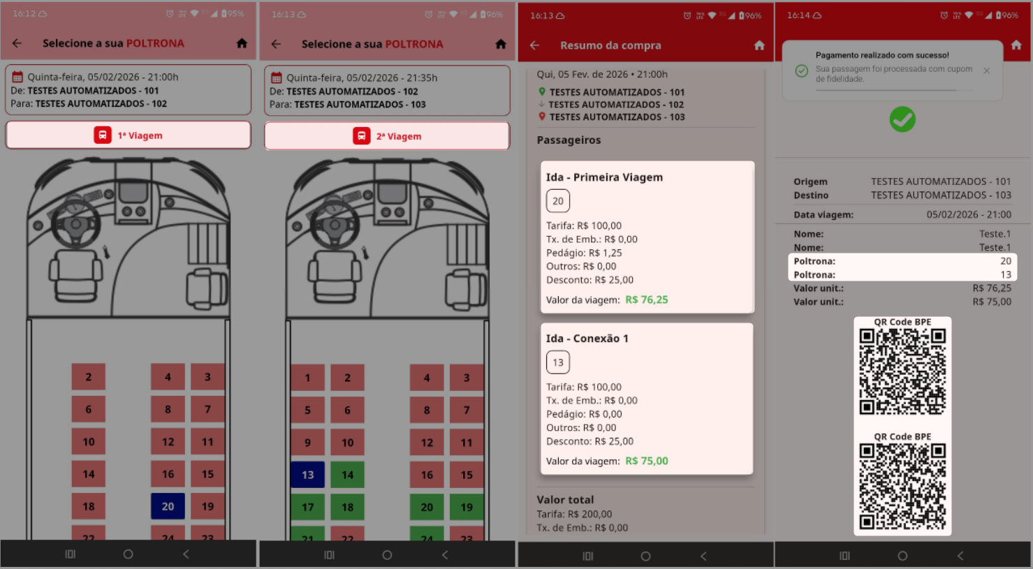 Figura 03 – Segue acima exemplificando uma venda com conexão de 3 viagens e seleção de mais de uma poltrona. Podemos observar os cards com as poltronas agrupadas; Nomes e detalhes das poltronas além dos QRcodes em separado para cada poltrona e viagem das conexões. Disponível em: APP FIDELIDADE – VENDAS MULTI CAIXA
