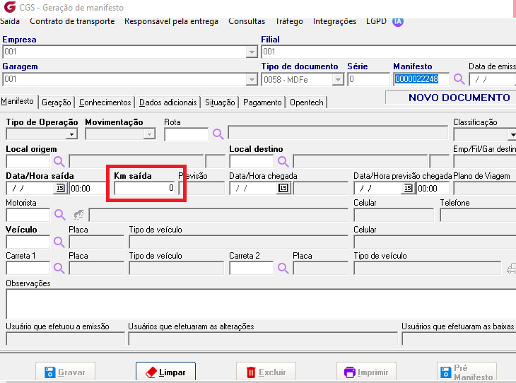 Com parâmetro desmarcado : O sistema obriga o campo para digitar o KM de saída no manifesto.