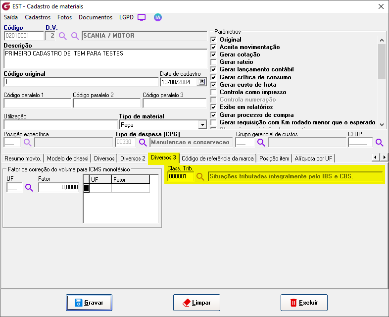 Implementado campo para inclusão de classtrib (classificação tributária) no cadastro de materiais. Cadastros> Materiais Implementado na aba "Diversos 3" o campo "Class. Trib." para informar a classificação tributária do material.
