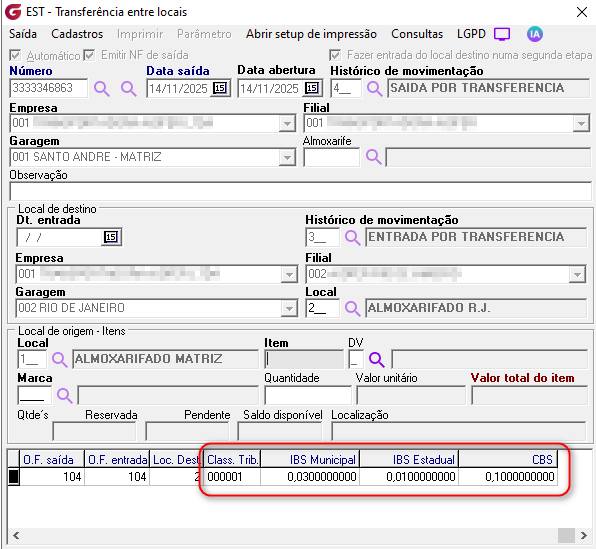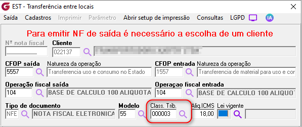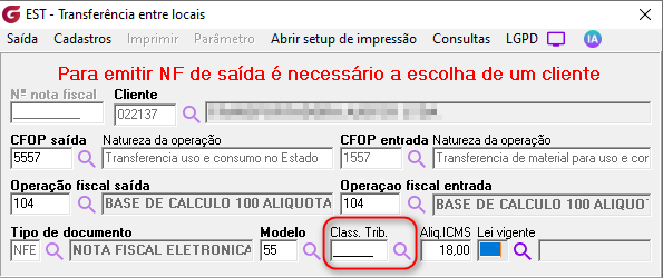 Na transferência de materiais, se informada a class trib, logo após o modelo do tipo de documento,