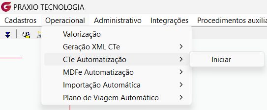 Ao abrir o módulo de Cargas Automatização acesse o menu Operacional à CTe Automatização e em seguida clique em Iniciar, conforme indicado na imagem abaixo: