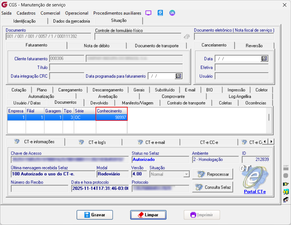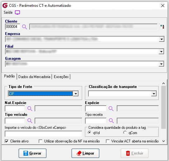 Obs.: Esta parametrização se faz necessária para que sejam indicados os clientes que irão utilizar o processo automatizado de CT-e, além de possibilitar inserir no sistema informações padronizadas quando estas não forem encontradas no arquivo xml da NF-e.