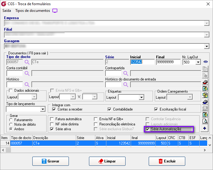Agora que definido os dados, será necessário indicar uma série exclusiva para o CTe ser emitido automaticamente, desta forma, será necessário acessar a tela Troca de Formulário e marcar o seguinte parâmetro para o tipo de documento 57 - CTe: