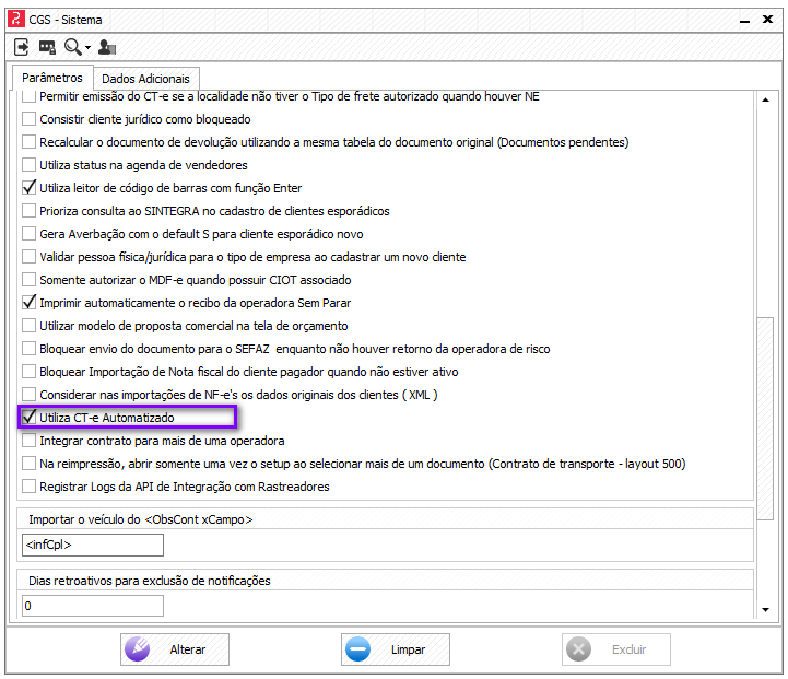 Para dar início ao processo de emissão automatizada, deverá ser marcada a opção "Utiliza CT-e automatizado" nos parâmetros de sistema: