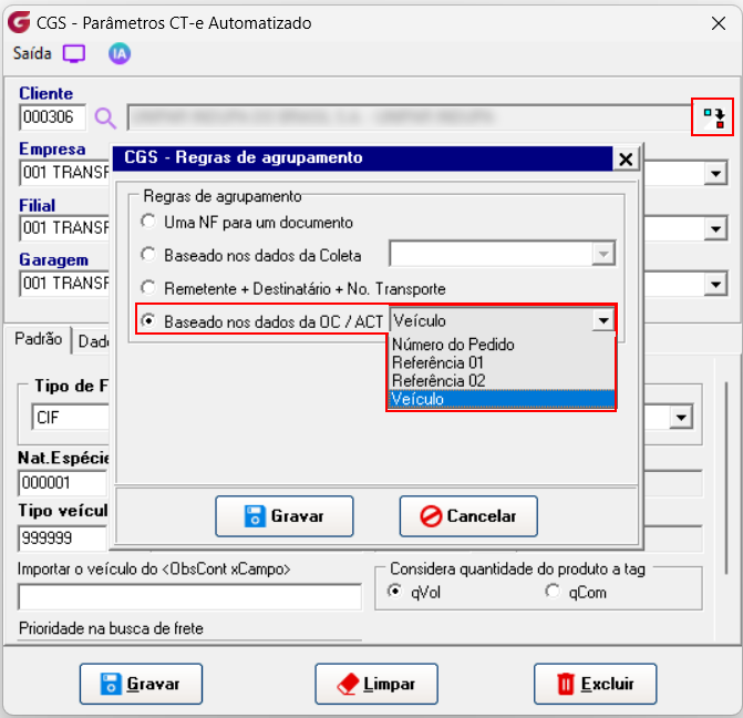 Desenvolver regra de agrupamento para emissão de CTe automático a partir do vínculo da OC / ACT. |
