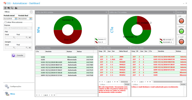 Para acompanhar o processo de emissão dos CT-es há um Dashboard onde é possível verificar em gráficos os status de: