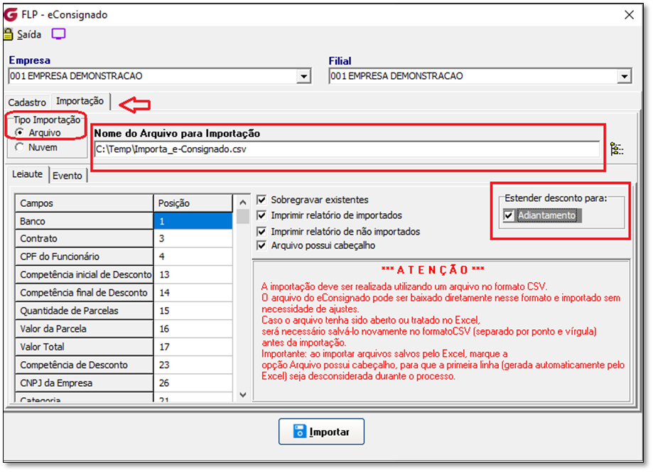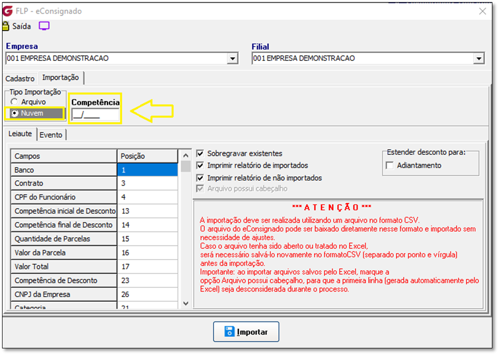 - O próximo passo será “Importar” o arquivo CSV 1.4 sempre na ultima versão disponível no site do Emprega Brasil.