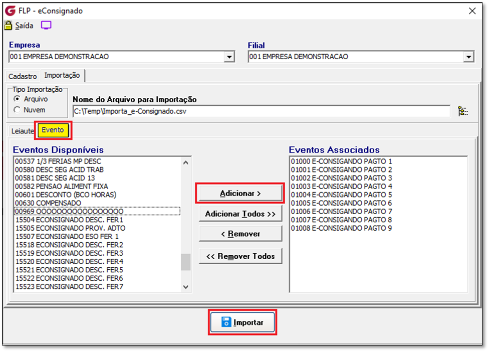 - No caso de funcionários com mais de um contrato, cada contrato será importado em um evento distinto, conforme a estrutura do arquivo originado pelo Emprega Brasil.