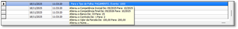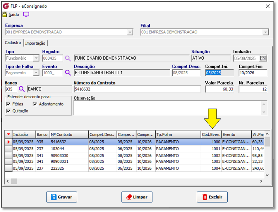 Ao digitar o trabalhador caso seja encontrado um evento já cadastrado para a mesma competência de desconto, os demais dados serão atualizados, permitindo alterações.