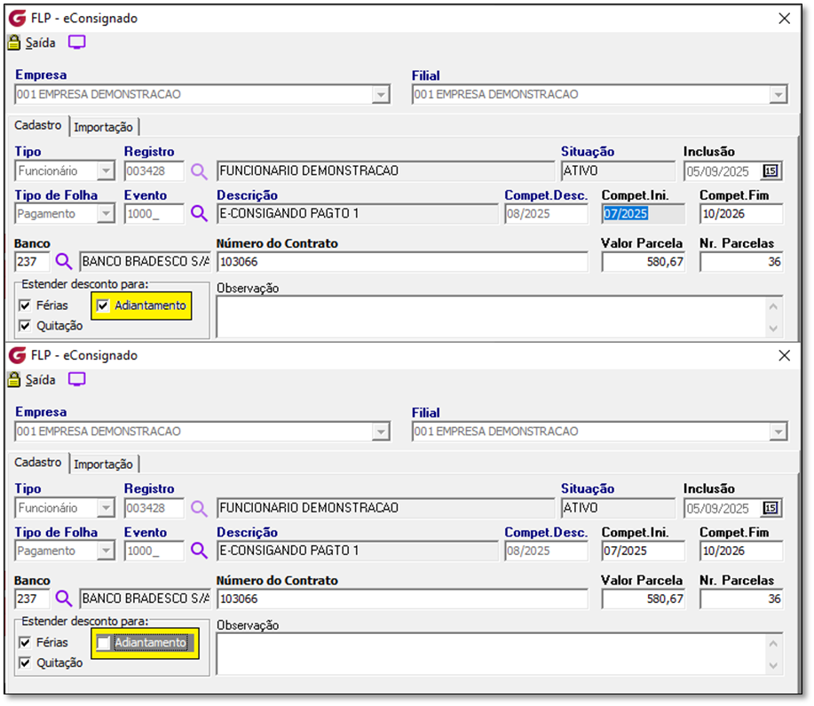 - Se a empresa não desejar aplicar o desconto no adiantamento, NÃO marque esta opção.