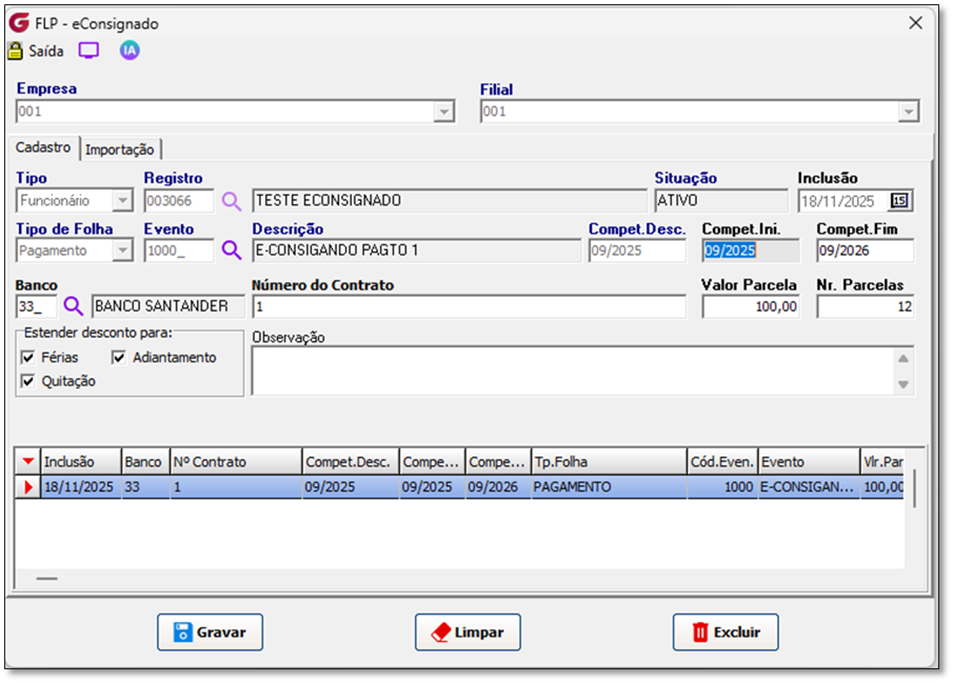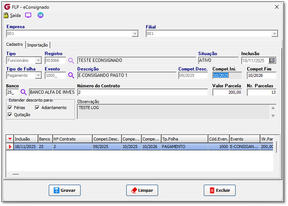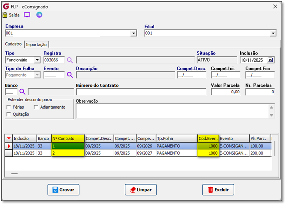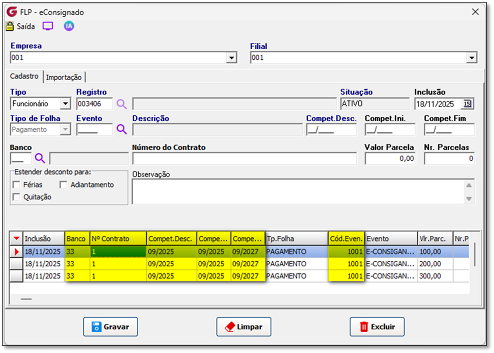 2º Alteração: Na tela de cadastro do eConsignado - Crédito do Trabalhador, o sistema não permite mais que o usuário cadastre parcelas com valores distintos quando os seguintes campos coincidem: