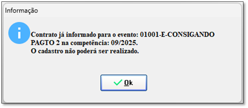 Quando já existir um contrato cadastrado para o mesmo banco e mesma competência e evento diferente será exibida a mensagem abaixo.