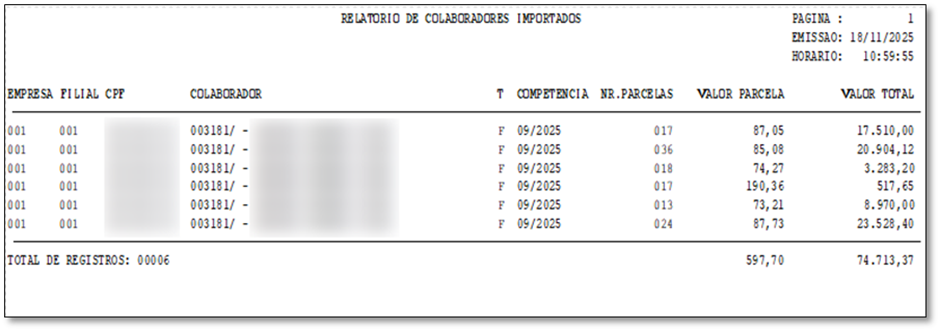 Após a importação, o sistema gera um relatório com os registros importados e não importados, facilitando a conferência dos dados.