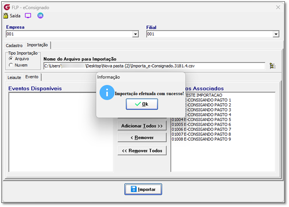 - Após a associação, informe o caminho onde salvou o arquivo a ser importado.