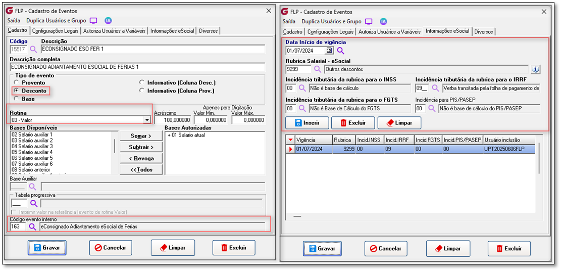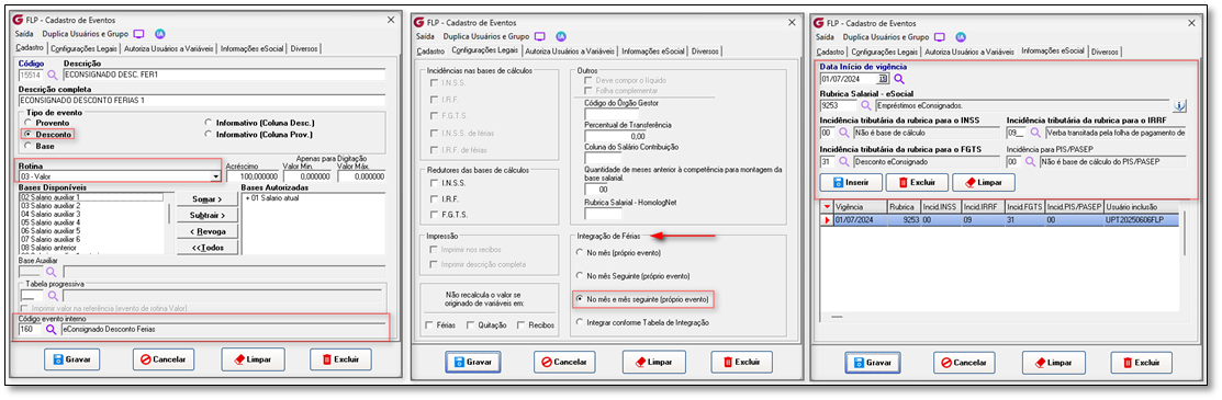Os novos eventos do 1º grupo devem ser integrados ao cálculo de férias na Tabela de Integração de Férias.