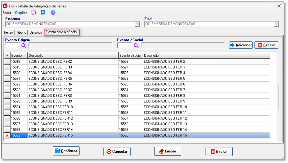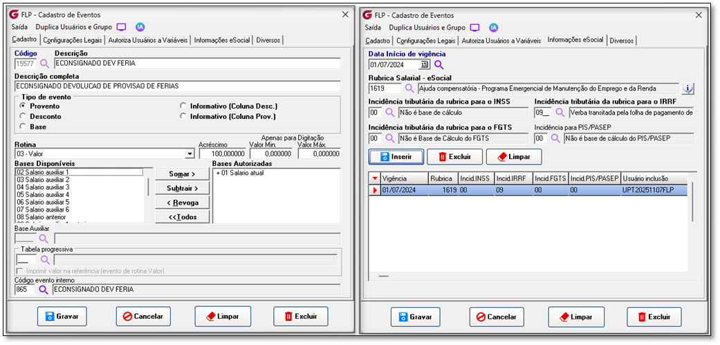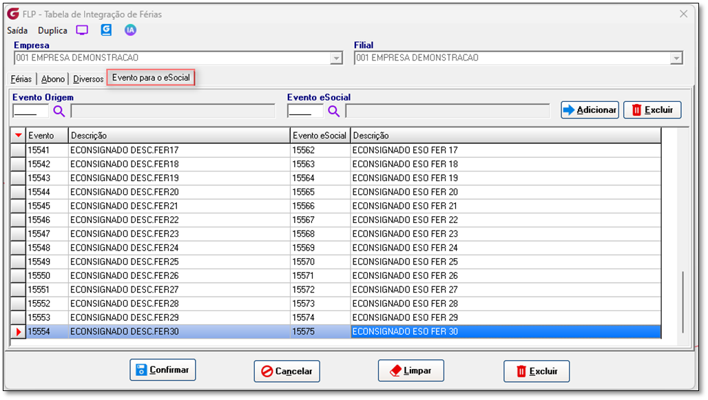 Exemplo de uso: Incluir os eventos no cálculo de férias conforme tabela de integração fornecida.