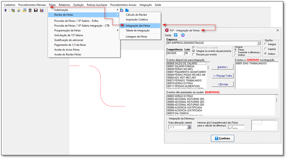 No módulo FLP, através do caminho Férias > Recibo de Férias > Integração das Férias, ocorre o processo de integração de verbas de férias.