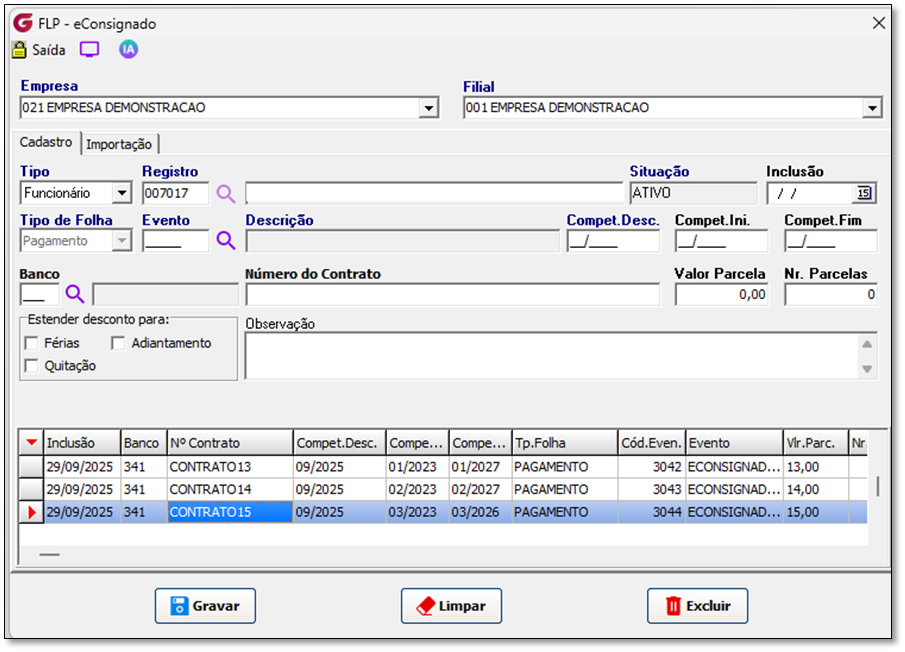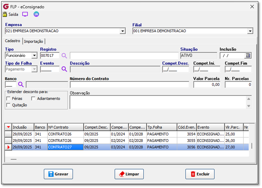 Atualmente, o sistema suporta até 9 contratos de eConsignado, utilizando os eventos internos: