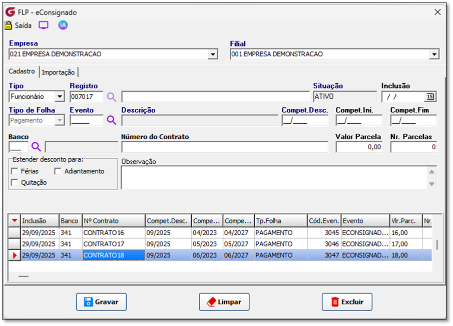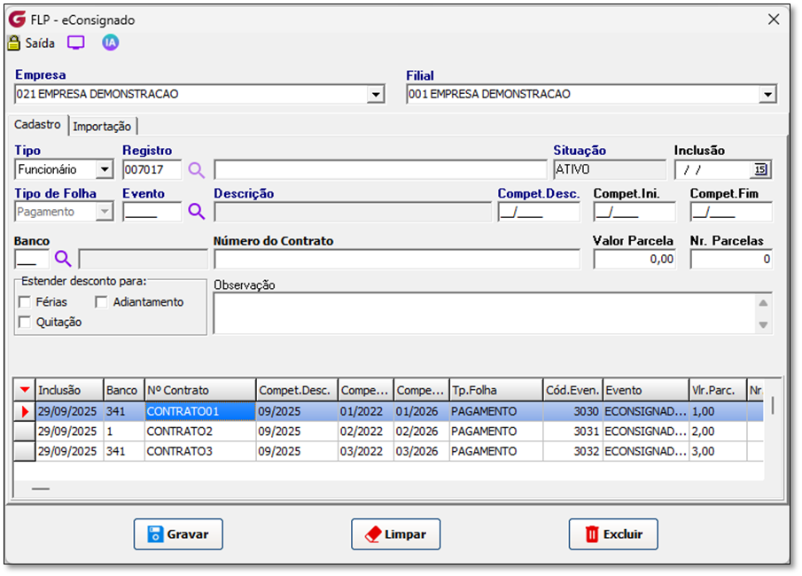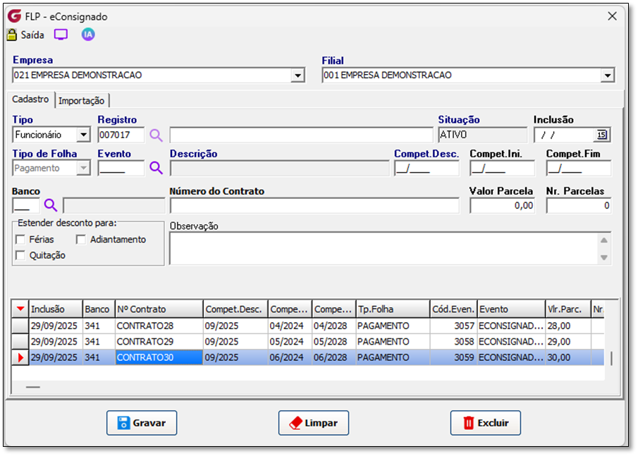 Vamos exemplificar no piloto 7017 com 30 cadastros dos empréstimos eConsignado para realização dos cenários.