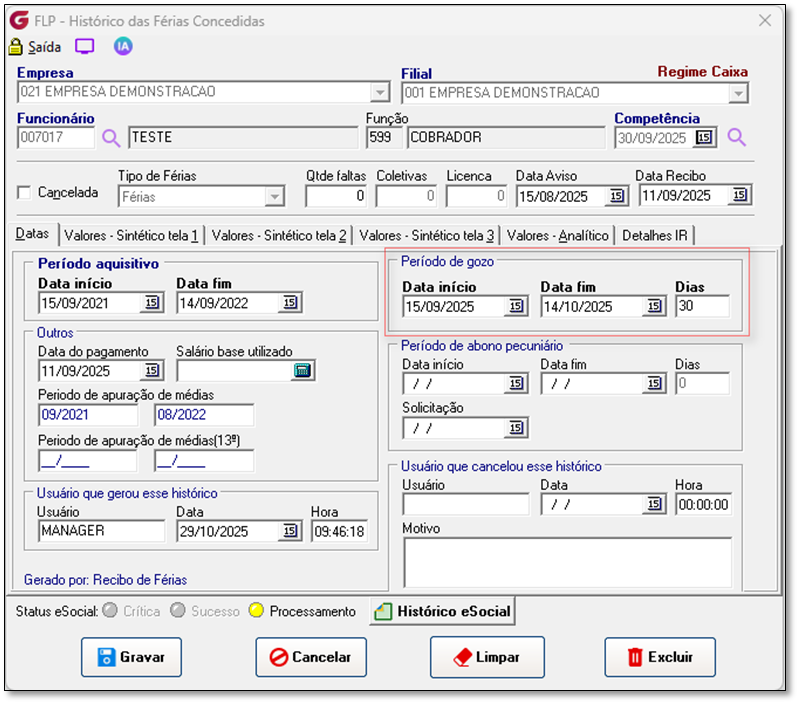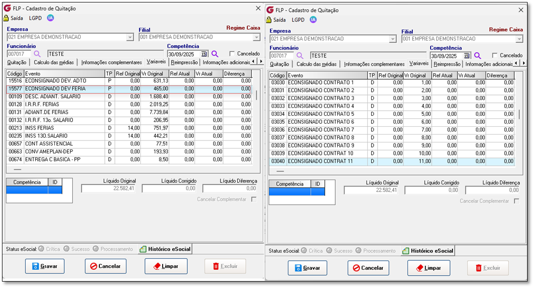 Validação: Valores devem estar consistentes entre férias e quitação.