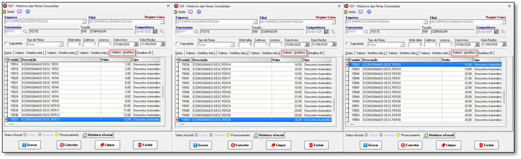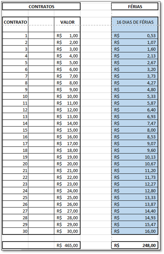 Conforme demonstrado no Histórico de Férias na aba “Valores Analíticos” 30 contratos descontados.