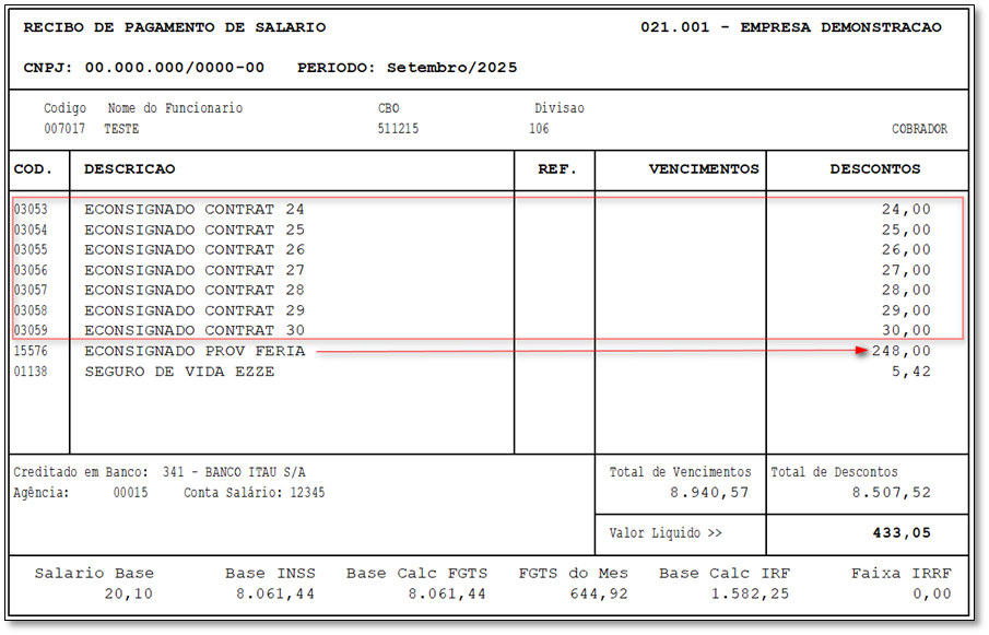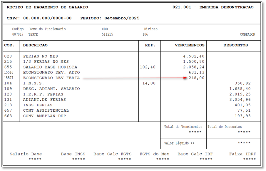 Verificar a integração dos descontos de eConsignado no cálculo de férias e pagamento.