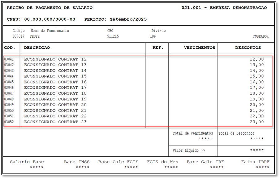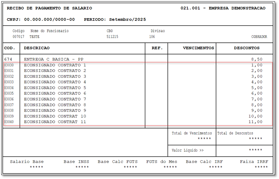 Os descontos dos contratos ativos de eConsignado serão aplicados conforme a margem consignável disponível do colaborador, garantindo o atendimento aos limites legais e a correta liquidação das parcelas. Os valores individuais de cada contrato permanecem detalhados.