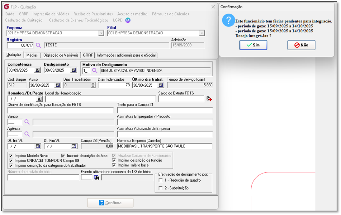 Verificar se os valores de férias são integrados corretamente na quitação.
