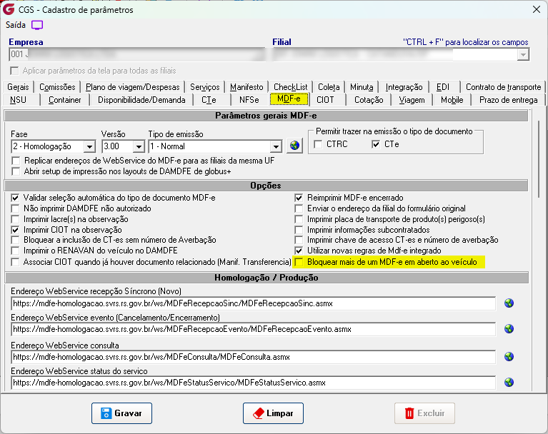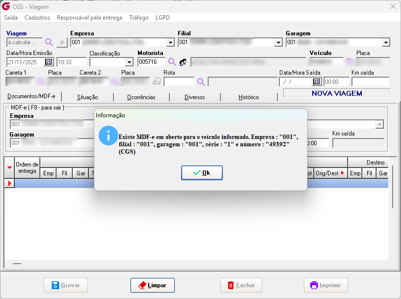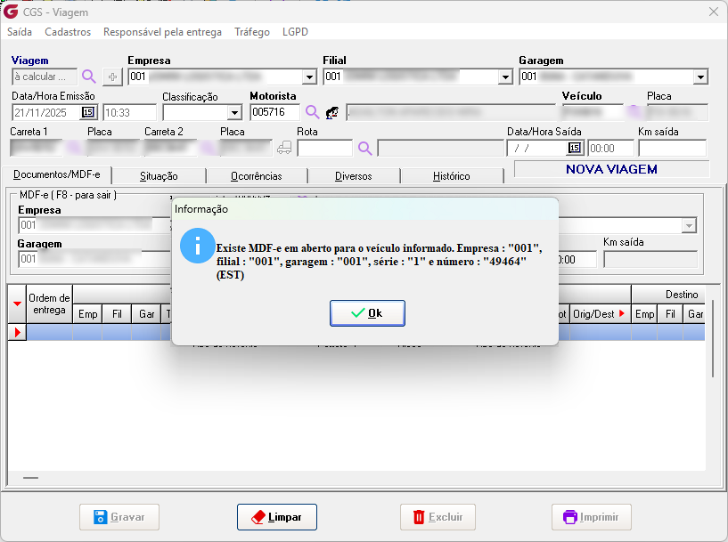Implementada opção para bloquear emissão de MDF-e para veículo já vinculado em MDF-e com status aberto. Com o parâmetro marcado, não é permitida a emissão de MDF-e para motorista + veículo/ Veículo que esteja vinculado em alguma MDF-e em aberto. Exemplo: O mesmo será apresentado caso o Veículo tenha sido utilizado em um MDFe emitido em outro módulo, exemplo o módulo de Estoque