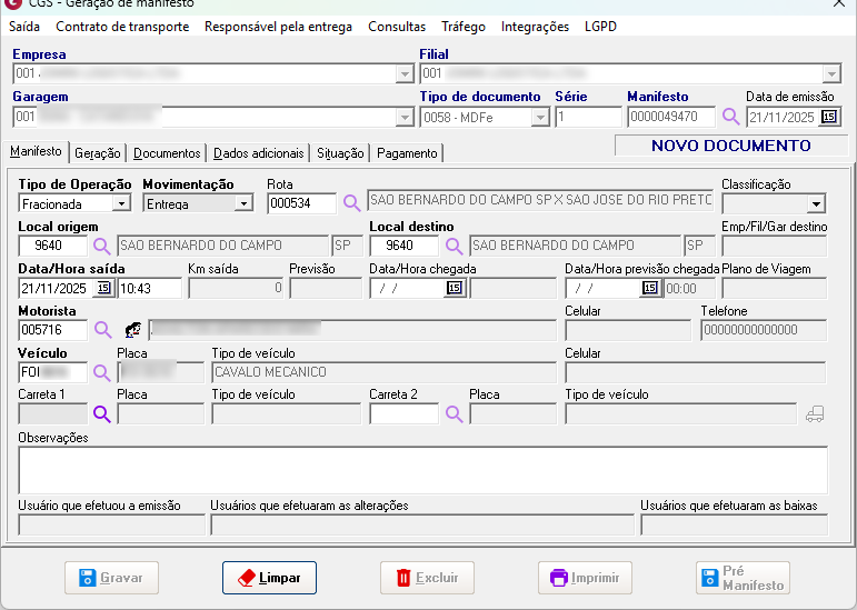 Informações adicionais - A rotina referente ao parâmetro que controla o bloqueio de um veículo vinculado a mais de um MDF-e em aberto será aplicada nas seguintes telas do sistema: