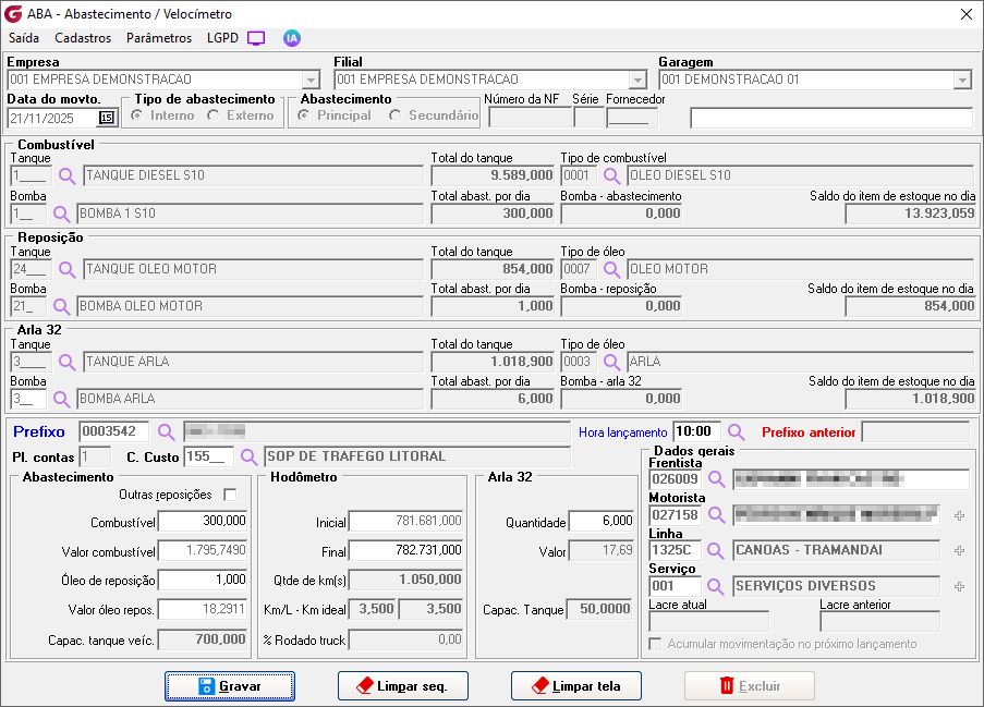 Empresa - Informe a empresa para movimentação Filial - Informe a filial para movimentação Garagem - Informe a garagem para movimentação Data do movto - Informe a data da movimentação Tipo de abastecimento - Selecione interno Abastecimento - Selecione a opção principal Combustível Tanque - Digite o código do tanque ou pesquise e selecione Total do tanque - Campo com o saldo atual do tanque Tipo de combustível - Campos com o código e descrição do tipo de óleo armazenado no tanque Bomba - Digite o código da bomba ou pesquise e selecione Total abast. por dia - Quantidade total abastecida no dia Bomba-abastecimento - Quantidade abastecida no dia pela bomba Saldo do item de estoque no dia - Saldo atual do item associado ao tipo de óleo Reposição Tanque - Digite o código do tanque ou pesquise e selecione Total do tanque - Campo com o saldo atual do tanque Tipo de óleo - Campos com o código e descrição do tipo de óleo armazenado no tanque Bomba - Digite o código da bomba ou pesquise e selecione Total abast. por dia - Quantidade total abastecida no dia Bomba-reposição - Quantidade abastecida no dia pela bomba Saldo do item de estoque no dia - Saldo atual do item associado ao tipo de óleo Arla Tanque - Digite o código do tanque ou pesquise e selecione Total do tanque - Campo com o saldo atual do tanque Tipo de óleo - Campos com o código e descrição do tipo de óleo armazenado no tanque Bomba - Digite o código da bomba ou pesquise e selecione Total abast. por dia - Quantidade total abastecida no dia Bomba - arla 32 - Quantidade abastecida no dia pela bomba Saldo do item de estoque no dia - Saldo atual do item associado ao tipo de óleo Prefixo - Dígite o código do prefixo ou pesquise e selecione o prefixo Hora lançamento - Informe a hora do lançamento Prefixo anterior - Campo com código do prefixo do último lançamento Pl. contas - Campo com código do plano de contas do veículo C.Custo - Campo com centro de custo associado ao prefixo, podendo ser alterado Abastecimento Combustível - Informe a quantidade de litros abastecido Valor combustível - Campo com o valor total do combustível Óleo de reposição - Informe a quantidade litros abastecido Valor óleo repos. - Campo com o valor total da reposição Capac. tanque veic. - Campo com informação da capacidade total do tanque do prefixo Hodômetro Inicial - Campo com informação do último hodômetro informado Final - Campo para informar o hodômetro no momento da movimentação Qtde de km(s) - Resultado da diferença entre o hodômetro inicial e final Km/L - Km ideal - Campos com os valores do km/l do abastecimento realizado e o km/l ideal informado no cadastro do veículo Arla 32 Quantidade - Informe quantidade abastecida Valor - Valor total da quantidade abastecida Capac. Tanque - Campo com informação da capacidade do tanque de ARLA do prefixo Dados Gerais Frentista - Digite o código do frentista ou selecione pelo botão de pesquisa Motorista - Digite o código do motorista ou selecione pelo botão de pesquisa Linha - Digite o código da linha ou selecione pelo botão de pesquisa Serviço - Digite o código do serviço ou selecione pelo botão de pesquisa Botão Gravar - Para gravar a movimentação clique no botão gravar Botão Limpar seq. - Clicando no botão os campos a partir da informação de prefixo são limpos Botão Limpar tela - Clicando no botão toda a movimentação da tela é limpa Botão Excluir - Utilize o botão excluir para apagar movimentação lançada anteriormente.