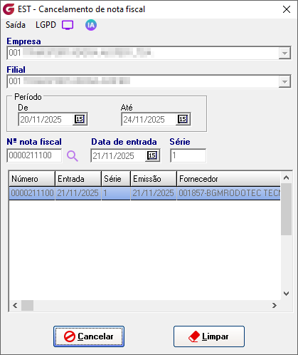 Rotina implementada para realizar o cancelamento do lançamento de entrada por nota fiscal. Diários >Cancelamentos >Nota fiscal (entrada) Filial - Informe a filial da movimentação Período | De / Até - Informe o período para pesquisa dos lançamentos Nº nota fiscal - Informe o número da nota fiscal ou utilize o botão de pesquisa para selecionar Grid - Grid com informação do número, data de entrada, série, data de emissão,código e descrição do fornecedor Botão "Cancelar" - Utilize o botão para cancelar a nota fiscal selecionada Botão "Limpar" - Utilize o botão para limpar a tela Não podem ser canceladas notas fiscais integradas a outros módulos, para cancelar revogue a integração. Se algum auxílio ou esclarecimento for necessário, conte conosco através de nossos canais de atendimento. Telefone: (11) 5018-2525. Portal do Cliente: https://portaldocliente.praxio.com.br/ #PodeContar