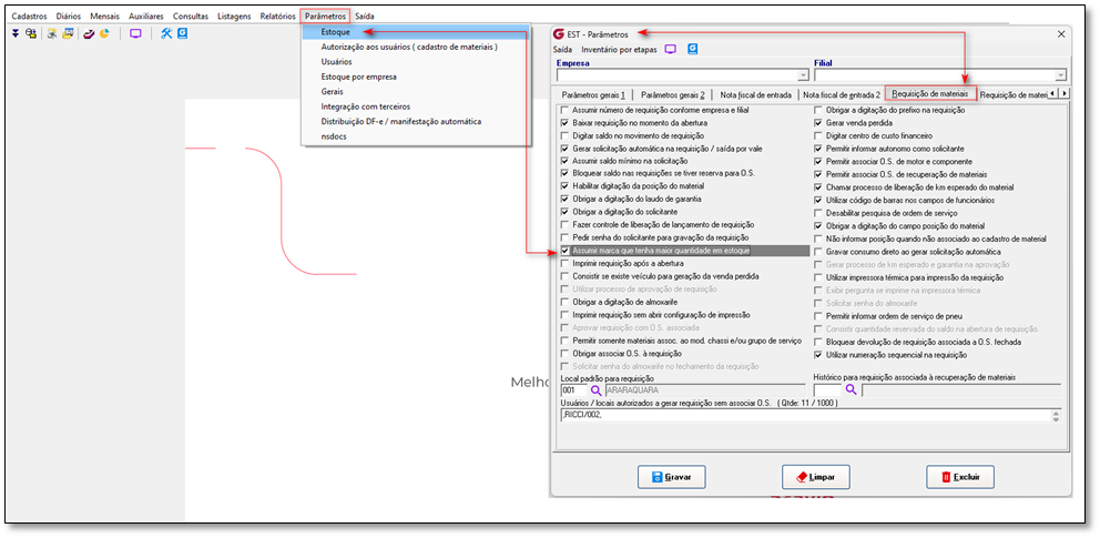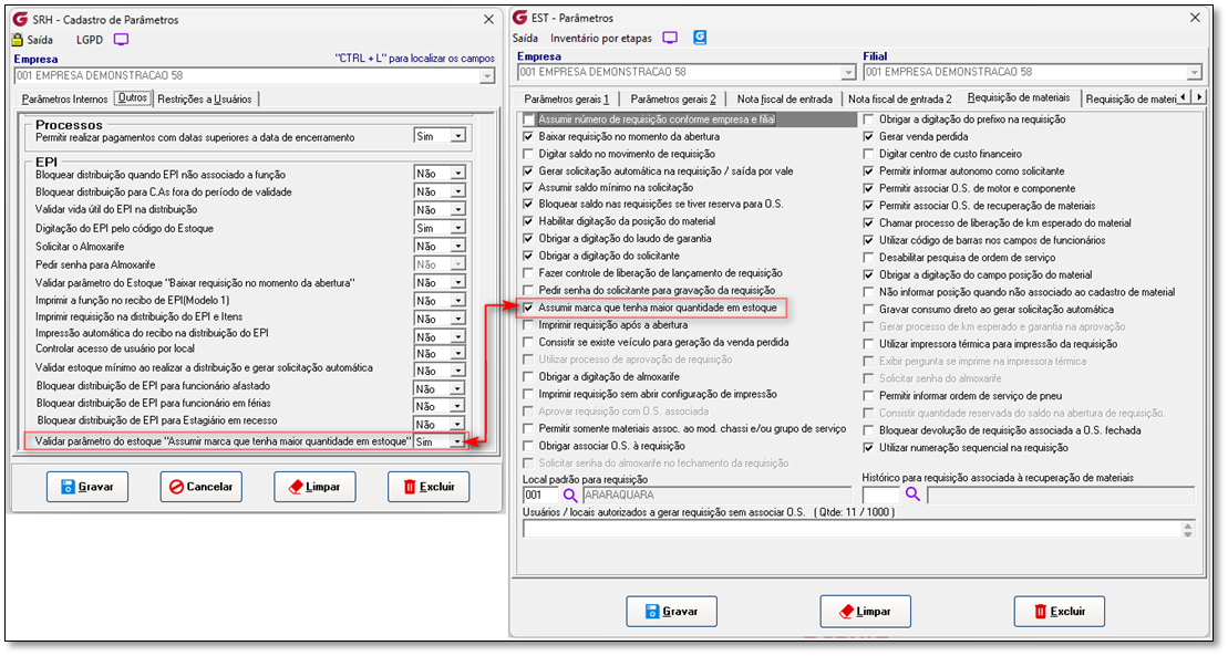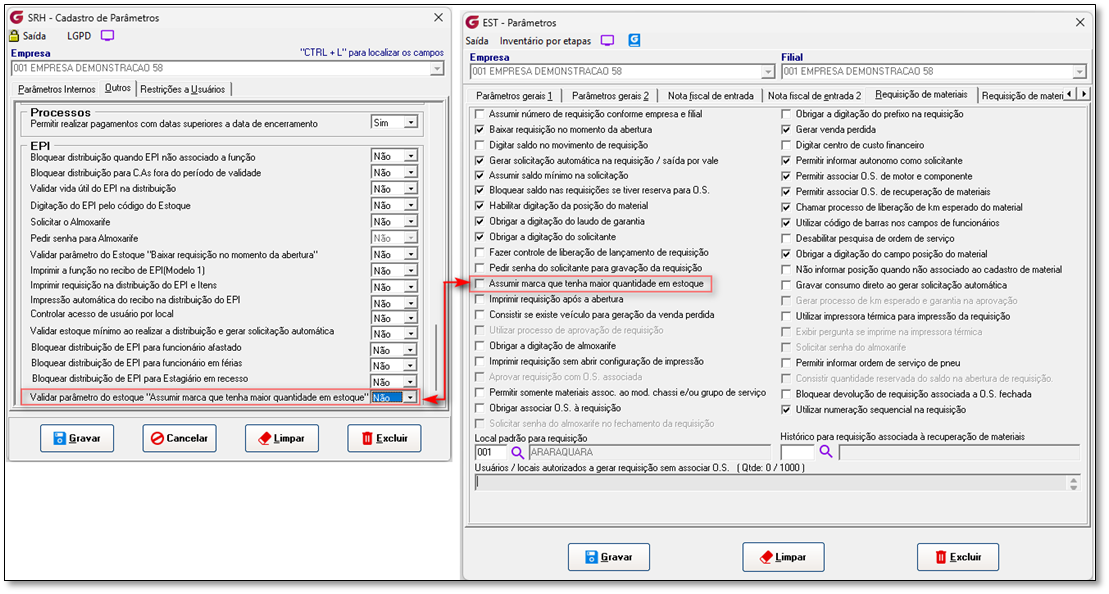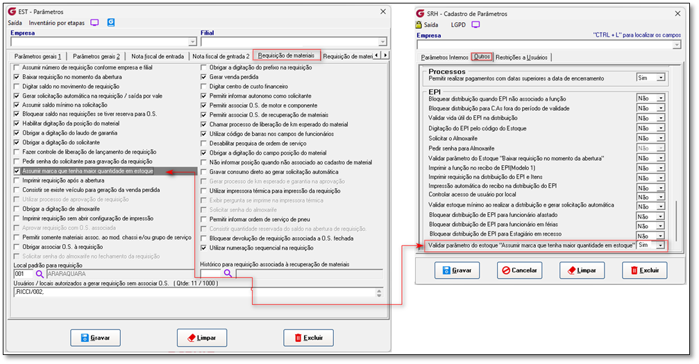 Módulo: Sistema de Recursos Humanos (SRH) Caminhos de acesso: SRH – Cadastro – Parâmetro – Outros – “Validar parâmetro do Estoque: Assumir marca que tenha maior quantidade em estoque” EST – Parâmetros - Estoque – Outros – “Assumir marca que tenha maior quantidade em estoque” |