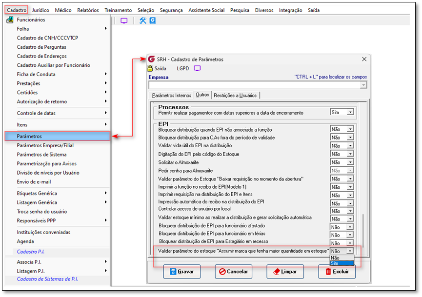 Implementado no módulo Sistema de Recursos Humanos a validação do parâmetro de estoque “Assumir marca que tem maior quantidade no estoque”, garantindo que, ao distribuir um EPI, a baixa seja registrada na marca com maior saldo em estoque. |