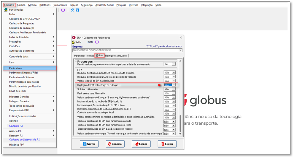 - Localize a opção: “Digitação do EPI pelo código de Estoque”