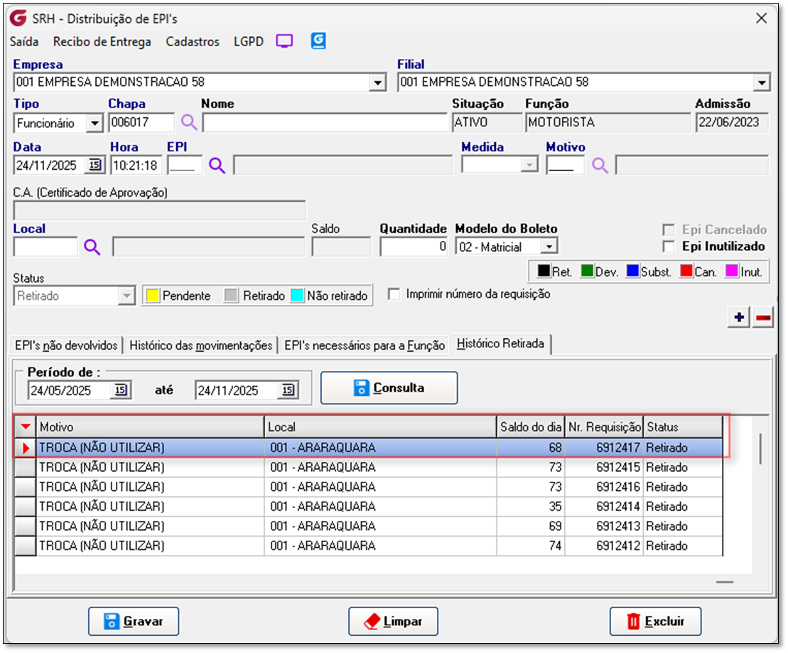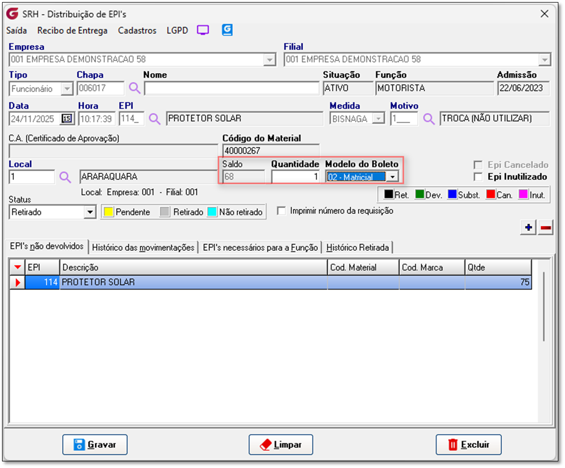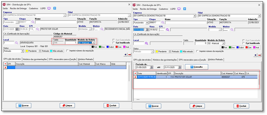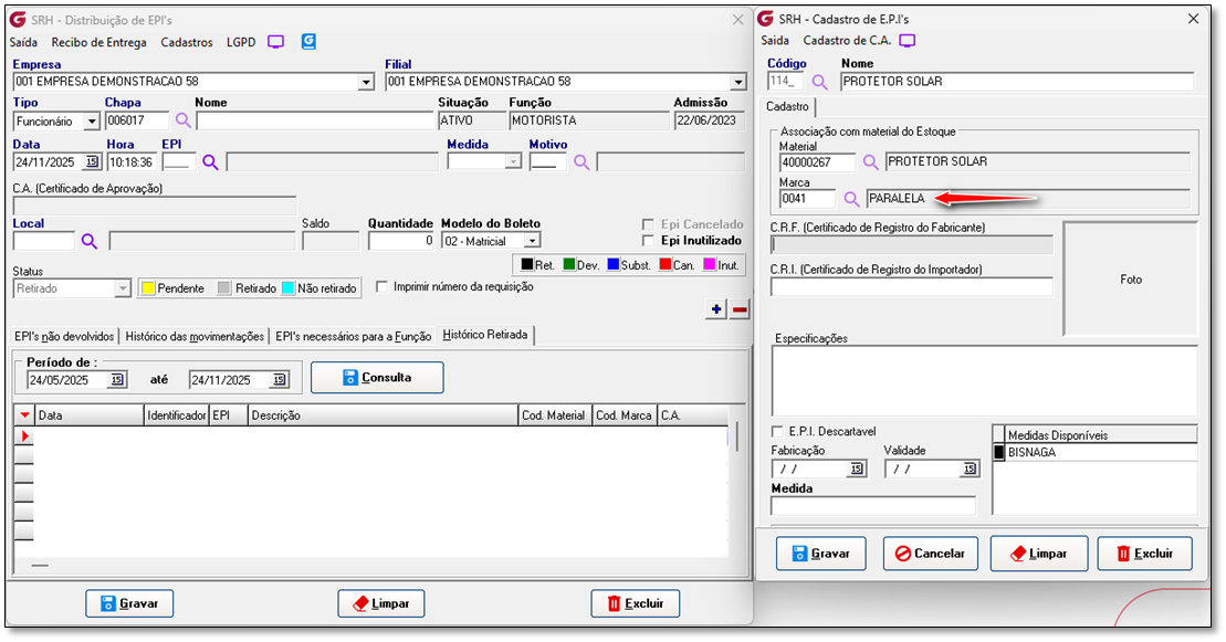Após as parametrizações dos dois módulos ativados, na tela de Distribuição de EPI, ao carregar as informações de um EPI, o sistema agora consulta automaticamente o estoque e seleciona a marca que possui a maior quantidade disponível.