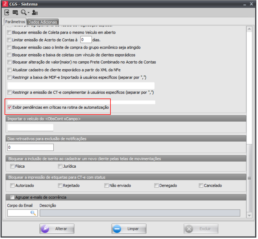 Na tela de parametrização do sistema foi adicionado um novo parâmetro: "Exibir pendências em críticas na rotina de automatização"