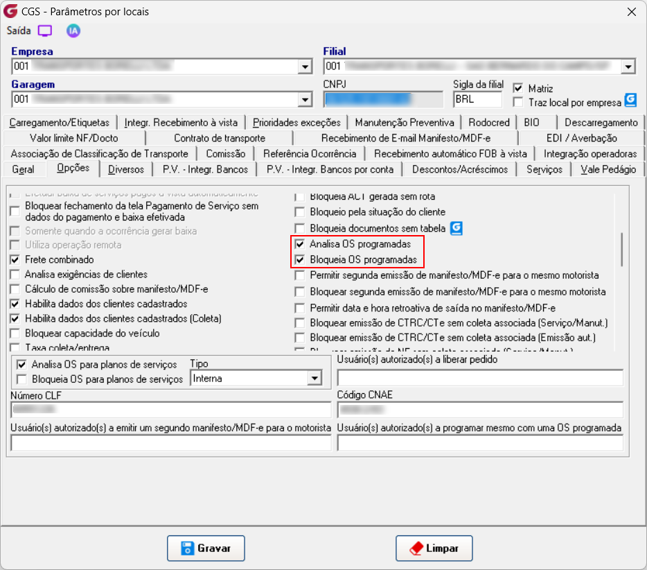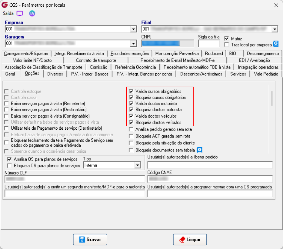 Ele validará os parâmetros relacionados a motorista e veículo de acordo com o utilizado nos parâmetros locais