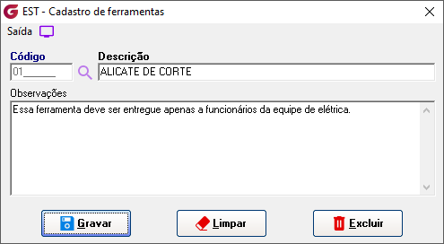 Implementada rotina para controle de movimentação de ferramentas. Cadastros> Ferramentas Tela para cadastro das ferramentas com campo para observações.