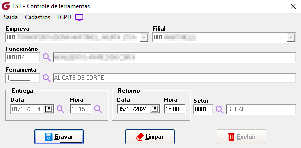Diários> Controle de ferramentas Na tela de controle de ferramentas informe a empresa/filial da movimentação, selecione o funcionário e a ferramenta em seguida informe a data/hora da entrega, o campo setor é opcional. Quando o funcionário devolver a ferramenta informe a data de retorno.