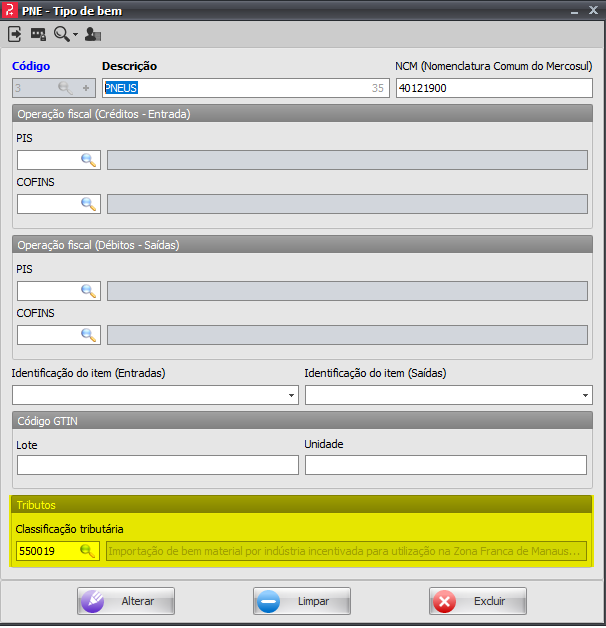 Módulo: Pneus (PNE) Caminho de acesso: >Cadastros> DVS> Tipo de bem |