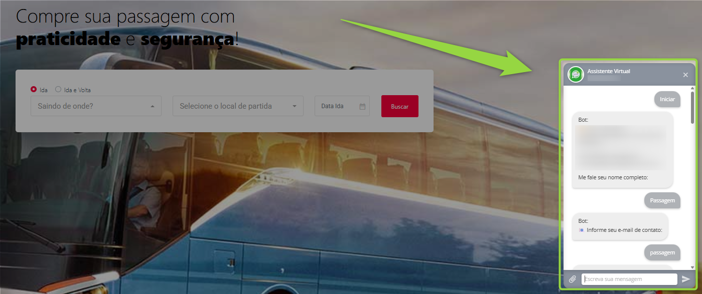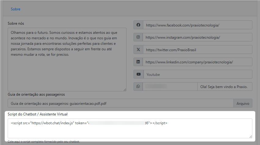 O que há de novo: Para realizar a configuração, basta acessar o configurador do site institucional, na aba “Sobre”, onde foi adicionado o campo “Script do Chatbot / Assistente Virtual”. Nesse campo, deve ser inserido o script fornecido pela plataforma de chatbot utilizada pela empresa. Após a configuração, o assistente virtual será exibido automaticamente no site institucional, possibilitando a interação em tempo real com os visitantes. Imagens meramente ilustrativas: Figura 02 - Imagem ilustrativa da tela principal do site institucional. Destaque para janela de assistente virtual.