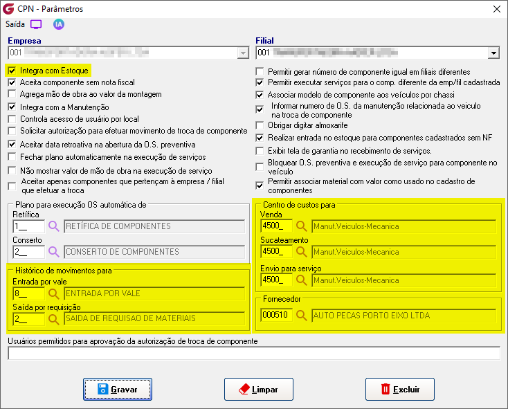 Informe a empresa e filial Marque a opção "Integra com Estoque" Informe o histórico para movimentos de entrada por vale Informe o histórico para movimentos de saída por requisição Informe os centro de custo para "Venda", "Sucateamento" e "Envio para serviço" Informe um fornecedor. Cadastros >Componentes No cadastro dos componentes associe itens de estoque, local e marca ao componente. Movimentações >Envio para serviço externo Informe o fornecedor, o tipo de serviço e o componente que será enviado.
