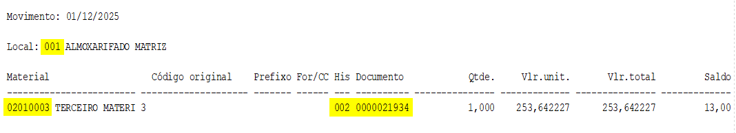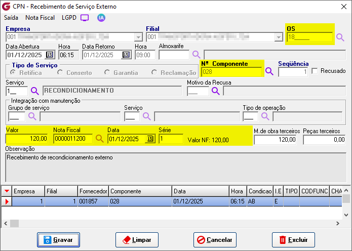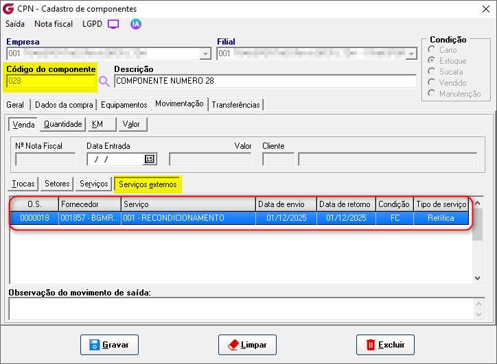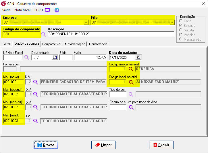 Os dados informados na nota fiscal são registrados na movimentação do componente.